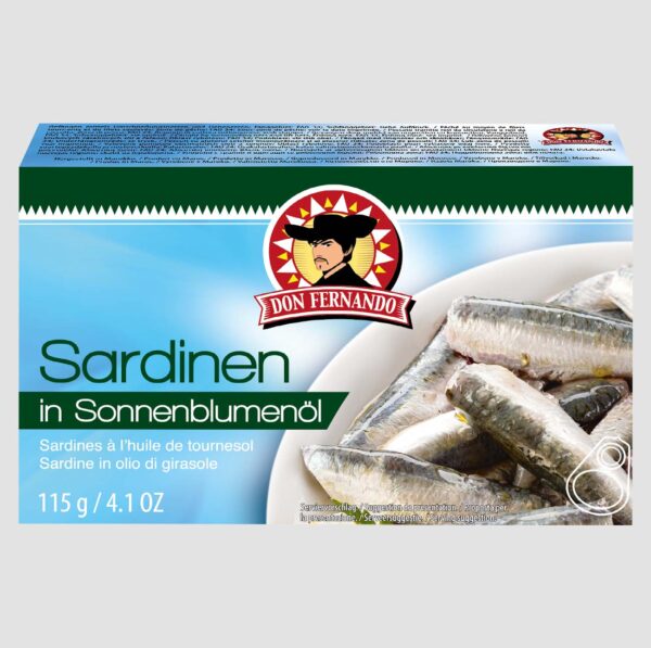 Zarte Sardinen – Filets von Don Fernando in feinem Sonnenblumenöl. Ideal als Antipasti oder einfach zu frischem Baguette und Salat.